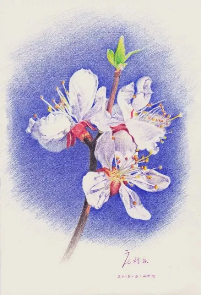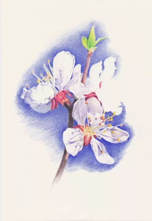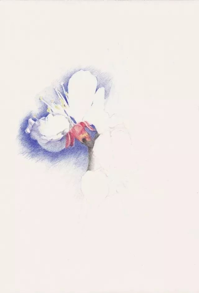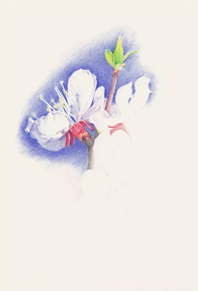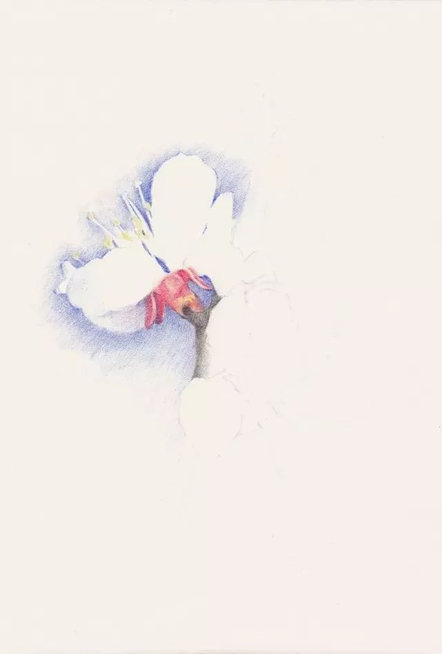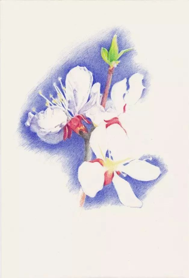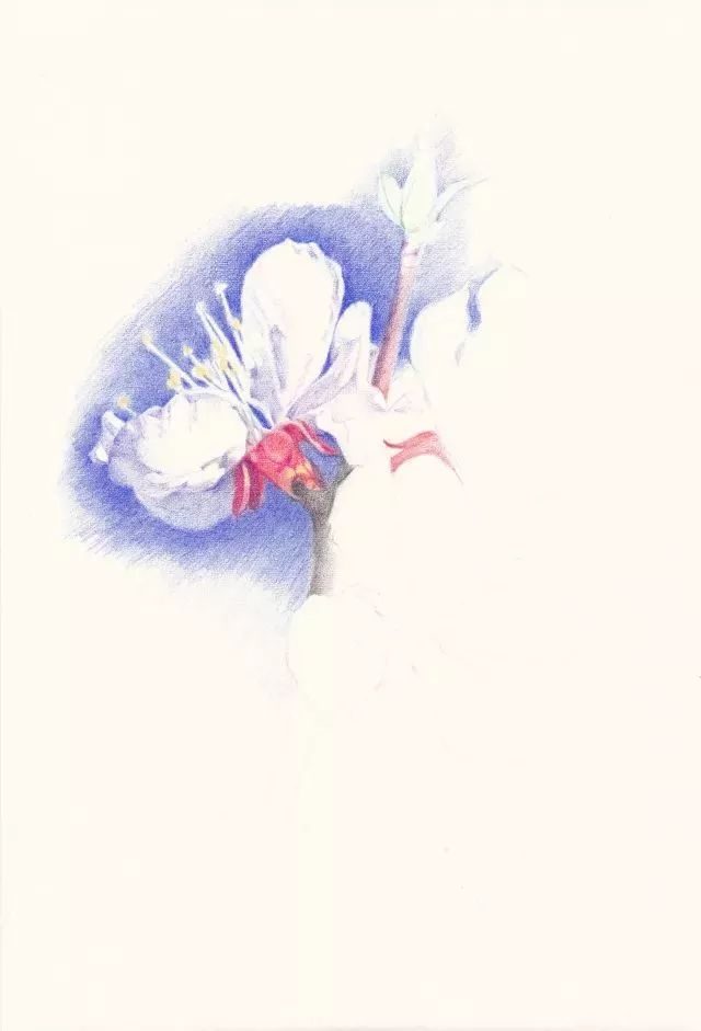 第2步 从最左边的一朵杏花开始,先用蓝色将花边缘的天空画出来,衬托出画的形状和白色的质感。杏花花萼反折是重要特征,用中黄、朱红色仔细体现