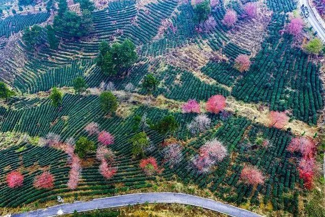 茶园里不仅能观赏到绿油油的茶海风光,到了冬末春初时节,茶海中的几株樱花纷纷绽放,粉色和绿色交相辉映,让画面看起来十分梦幻。