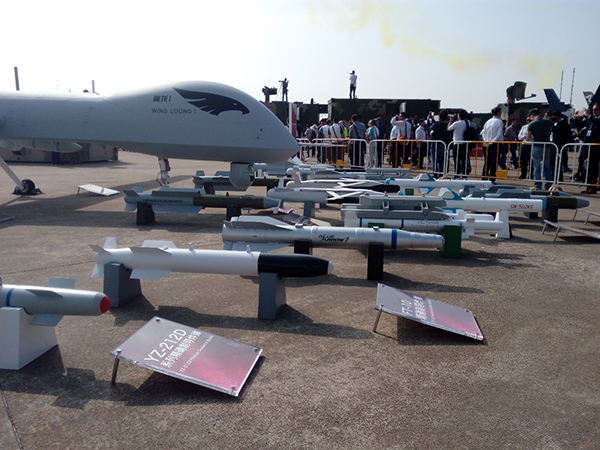 2016年珠海航展上“翼龙”无人机展出的各种弹药,满目琳琅。澎湃新闻记者 谢瑞强 图