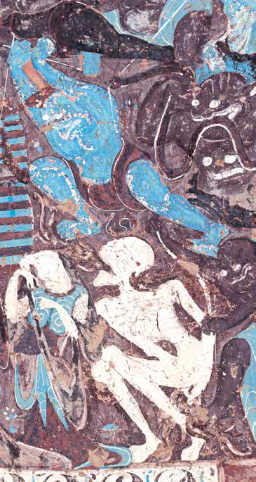 陈海涛作为陈琦的男友,当时虽然在北京电影学院,但也有机会一同参与了这次考察。他们在洞窟内仔细临摹,一边辨认着已经模糊的轮廓造型,一边分析画面的总体布局和走势,体会着古代画师是如何运用绘画来讲述一个让人多少会有些难以接受的佛经故事。一位太子,为了救一只饥饿的母虎和它的幼崽,宁愿牺牲自己的生命。这个在佛教美术中常见的题材,从未被表现得如254窟这铺壁画般具体动人。大多数情况下,这个故事被描绘得简率直露,突出血淋淋的啖食场面,而这铺壁画却表现得特别荡气回肠,让人更能够感受到萨埵舍身的坚定信念以及全力奉献的担当精神。有一处细节在其他同题材的绘画里从未见过:萨埵本来已经躺在地上等待老虎来啖食,但老虎实在太虚弱了,根本无力下口,于是萨埵用竹枝刺破喉颈,再次跳下山崖,让老虎可以先舔他的血,恢复精神后再食其肉,最终得救。画面上同时表现了用竹枝刺颈的萨埵和跳下山崖的萨埵,他们的眼神相互对视,似乎在彼此问询 :“献出生命,你后悔吗?你希望得到什么?”“不,我绝不后悔,我不求尊荣富贵,唯愿帮助众生……”这种深邃的对目光与神思的关注,对情感和内心的探究,使画面不再仅仅是佛教教义的简单图解,而是具有了一种触动人心的艺术特质,这让他们切实感受到什么是东晋画家顾恺之讲过的“传神写照尽在阿睹中”“手挥五弦易,目送归鸿难”。