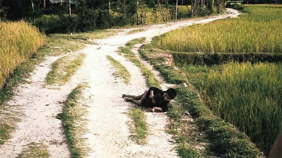 枪声停止时,陈文德发现母亲遍体鳞伤,鲜血从中弹处喷涌而出。他的妹妹哭起来,母亲担心哭声把士兵引回来,让两个孩子去邻村的外婆家里躲避。