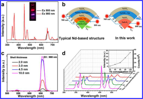光开关材料(Photoswitchable materials)在高密度光学数据存储、光电器件、化学传感以及生物医学等新兴领域有着重要应用前景。稀土掺杂的上转换发光纳米晶,因具有近红外窄谱带激发、宽能域多谱带上转换发射和高的光稳定性等特点,而被认为是性能优异的光转换功能材料。通过掺杂与结构调控技术构建的复合上转换纳米晶光开关材料已被应用于调控有机分子结构、实现分子手性翻转和肿瘤多模式协同治疗等领域。目前,所有已报道的上转换光开关都被限制在Nd3+和Yb3+共敏化材料体系,导致材料结构复杂,开关关闭性不严。