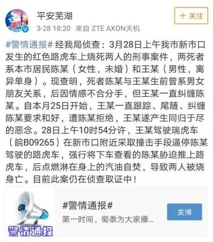 28日中午12:43 ,芜湖市公安局对外通报称,3月28日上午10时55分,芜湖市公安局110报警台接到群众报警:新市口有一滑行的红色suv汽车起火燃烧。110指挥中心立刻指令消防和公安民警出警组织扑灭。火势扑灭后,警方发现,车上两名成年人被烧死。