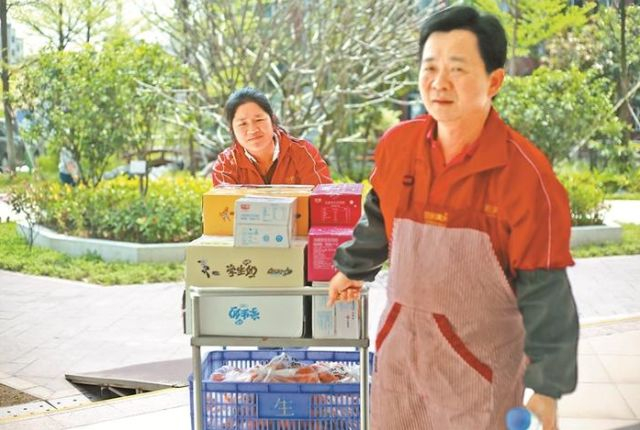 临近中午,送餐公司工作人员满载午餐盒饭在校园里忙碌着。