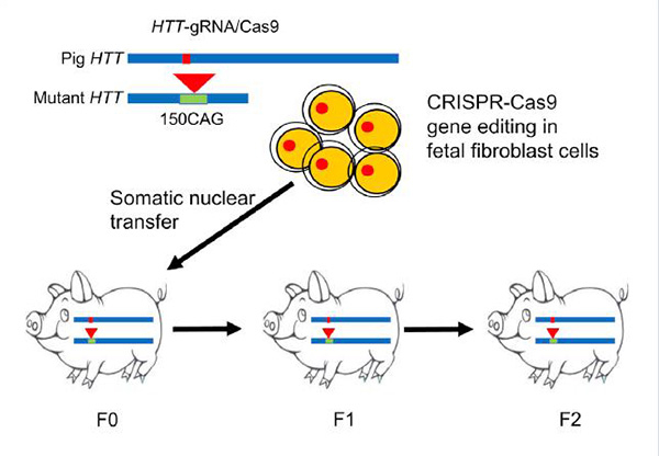 最新的进展是,该疾病的大动物模型成功建立。北京时间3月30日,生物学顶级学术期刊《细胞》(Cell)在线发表了中国科学家的一项重大成果:首次利用CRISPR/Cas9基因编辑技术和体细胞核移植技术(SCNT),成功培育出世界首例亨廷顿舞蹈病基因敲入猪,精准地模拟出人类神经退行性疾病。2个月以前,中国科学家获得全球首个体细胞克隆猴的成果也发表在该期刊。