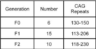 不过有趣的是,基因型分析显示,CAG重复并不稳定。实验结果得出,在F0代中是130-150 CAGs,F1代是113-206 CAGs,F2代是118-230 CAGs。另外,在不同组织中CAG重复也是不一致的。