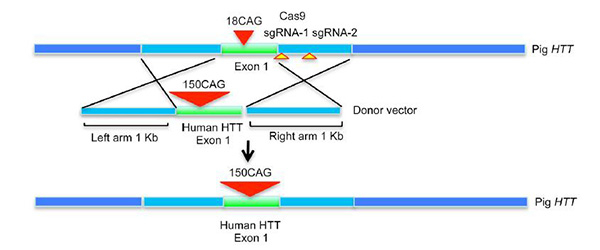 研究团队利用CRISPR/Cas9基因编辑技术将人突变的亨廷顿基因,即人外显子1中包含150 CAG重复序列精确地插入猪的亨廷顿蛋白内源性基因中。研究团队通过PCR筛选了2430个融水胎儿猪成纤维细胞,最终确定了9个阳性克隆细胞。