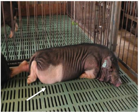 年龄较大的基因敲入猪皮肤则会有严重的褶皱和下垂。一些F0代基因敲入猪在5个月和10个月之间会过早死亡,也通常表现出走路畸形。这些症状都和人类相似。