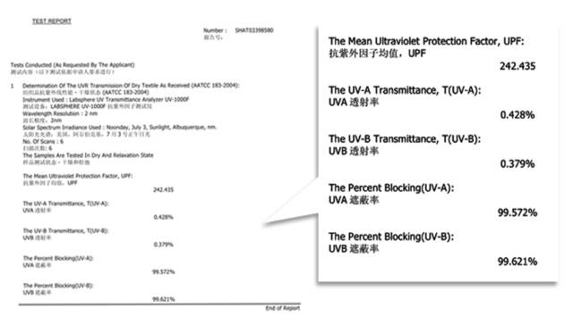*UPF是指紫外线防护指数,UPF值越高,紫外线防护效果越好,国家标准中纺织品的UPF值最高的标识是50+,说明只有1/50的紫外线可以透过织物。