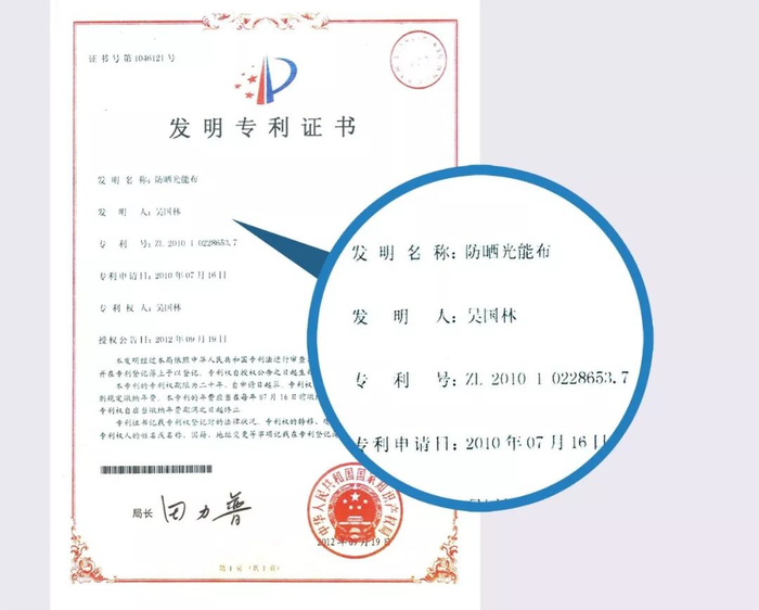 SUNSOUL面料(防晒光能布)获得国家发明专利证书(专利号:ZL201010228653.7)。