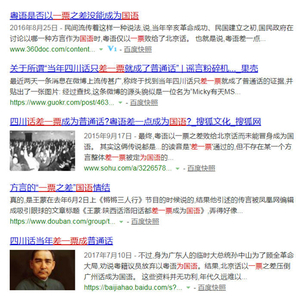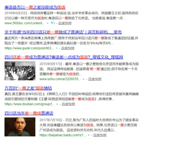 首先,《乡音》一文提到,“据说民国初期,很多议员来自广东,提出用广东话来做官方的标准口音”云云。此说在网上流传颇广,有人就据此演绎出“广东话差一票成国语”的段子。实际上,“____话差一票成国语”几乎是网上随处可见的选择题了,空白处的地名,绝不限于广东一地。