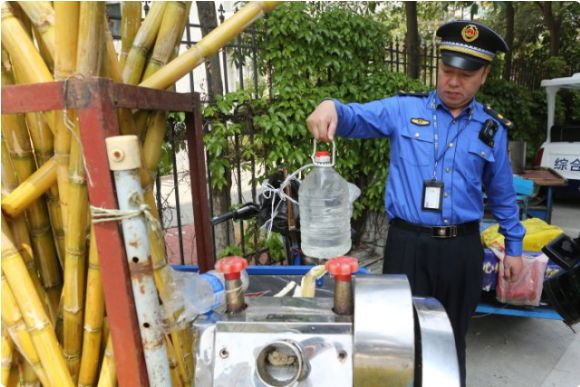 小贩何某某对执法蜀黍表示:“一条甘蔗能榨 5 杯甘蔗汁。”对于小贩何某某的这一说法,执法蜀黍表示怀疑,随后便立即细心检查起了榨汁机。