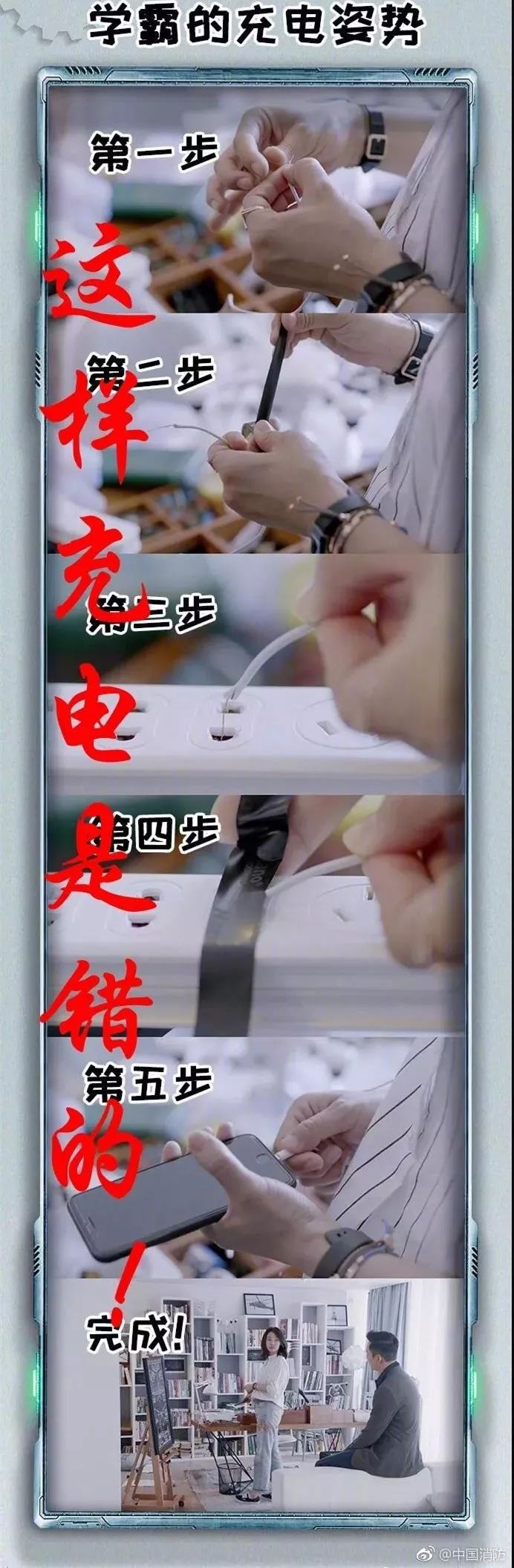 日前,某电视剧官博宣传时发布的“学霸的充电姿势”一图,引发了不小争议。原来,图中内容,竟是抛弃标配的充电插头,剥开充电线直接连接插线板!在这里,我们提醒大家务必注意充电安全!