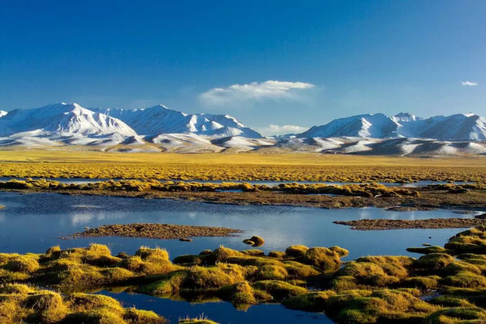 蓝天白云之下,山尖有一抹恰到好处的银白,绿油油的松树布满山间,而脚下的草甸早已泛黄,阔叶林则已换上秋装,红叶纷纷。