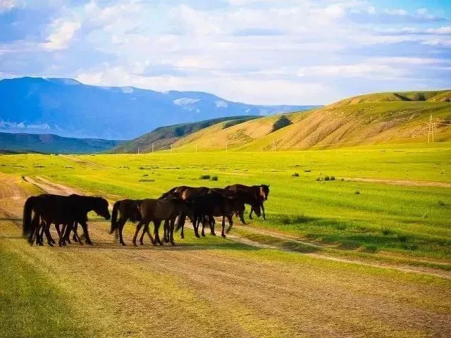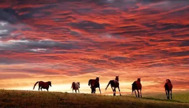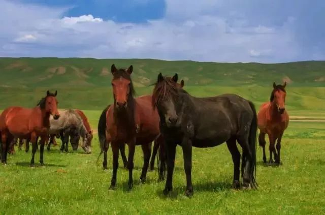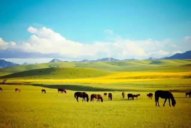 宽广的草原延伸到天空,散开的大马群勾勒出优美的山形,群山幻化成大块大块的云朵。