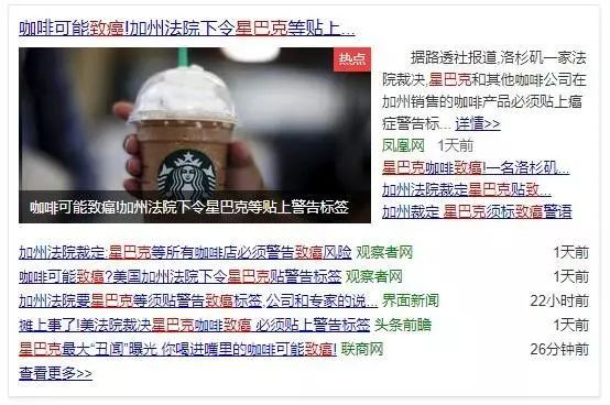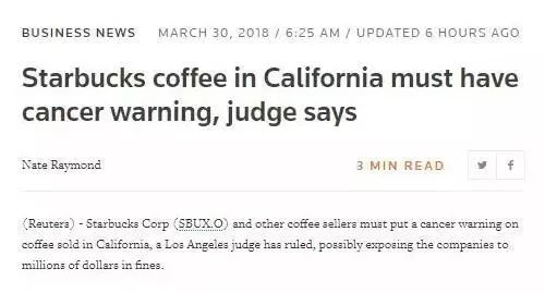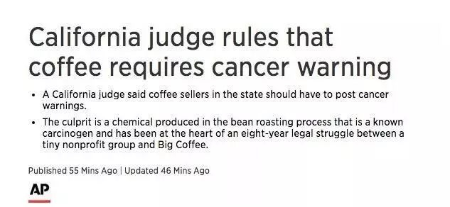 美联社报道称,美国洛杉矶一家法院裁决,星巴克和其他几家咖啡公司,在加州销售的咖啡必须贴上癌症警告标签。理由是,市面上出售的烘焙咖啡中,被发现含有的高浓度丙烯酰胺——一种有毒的致癌化学物质。