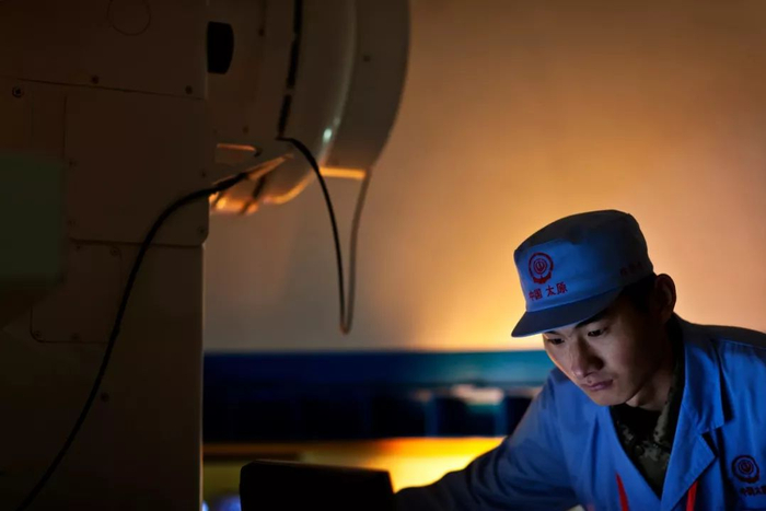 2011年11月8日,一名技术人员在太原卫星发射中心某光学点号光学设备前全神贯注地工作。新华社记者 刘彬 摄