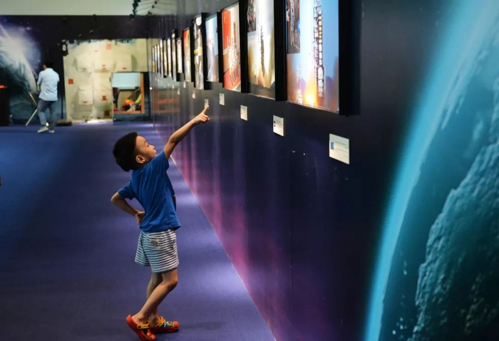 2017年7月26日“中国梦·航天梦——首届中国航天员飞天摄影作品展”在京举行。在北京天文馆,一名小朋友在摄影展上参观。新华社记者 王化娟 摄