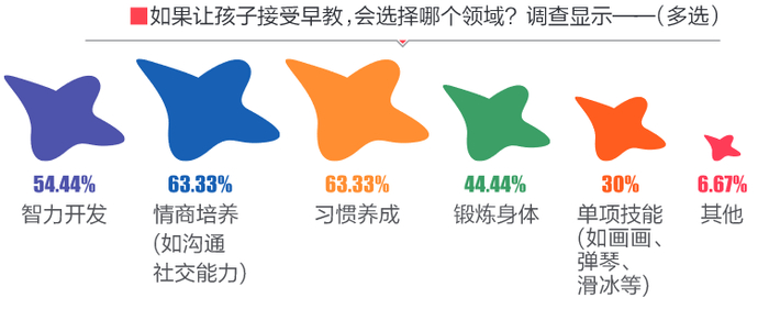 于是,针对不同年龄段、不同培训类别的“早教班”、“早教中心”也如雨后春笋般蓬勃而生。早教究竟应该从几岁开始?早教的初衷和目标是什么?孩子接受早教后是否真的有积极变化?日前,记者就此类问题展开了一次问卷调查。