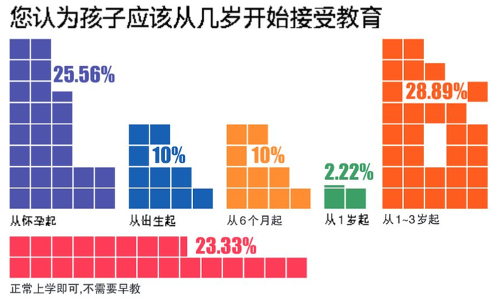 在问卷调查中,23%的受访者赞成应当从怀孕时就开始对胎儿进行早教,仅有23.3%的受访者认为孩子正常上学即可,不需要早教。