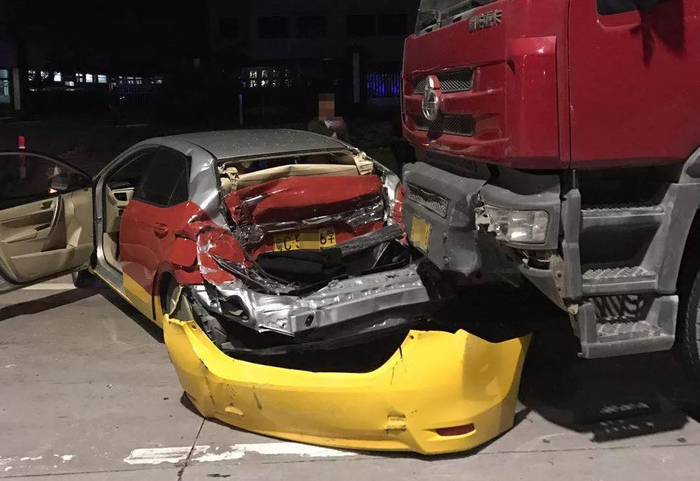 黄某虽然急踩了刹车,但泥头车刹车距离较长,竟然一时半会儿刹不住车,黄某怕翻车又不敢急打方向,只能眼睁睁看着撞上教练车尾部,一直推了10米才停下来。万幸的是,事发时泥头车是空车,否则后果不堪设想。▼