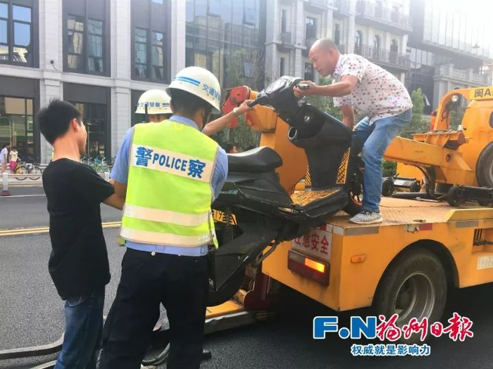 ▲交警将暂扣电动车抬上拖车(资料图)