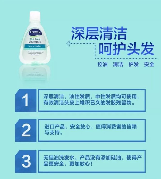 Redwin茶树油洗发水专对头发清洁问题而设计,彻底清洁头发头皮上堆积已久的其他洗发水或发胶残留物,彻底杀菌,去油,清洁头皮堵塞的毛孔,从而可以预防和辅助治疗脂溢性脱发。