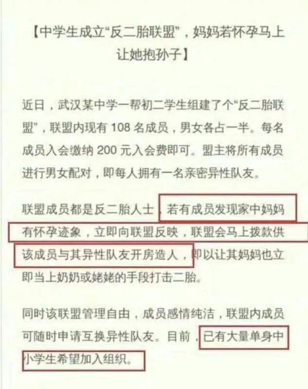 【传闻】网上热传一张图片,声称“近日,武汉某中学一帮初二学生组建了个‘反二胎联盟’,联盟内现有108名成员,男女各占一半。每名会员入会缴纳200元入会费即可……目前已有大量单身中小学生希望加入组织”。