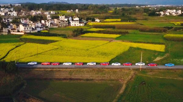 零排放的特斯拉车队驶入中国徽州古村落,和大自然融合一起。特斯拉供图