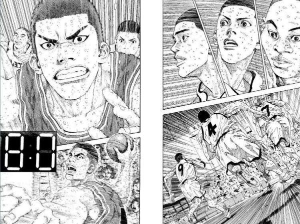 分镜上也是进步神速。为了让比赛氛围更加逼真刺激,从第一场湘北对陵南的练习赛,到终局对阵山王工业最后15秒、逆天的四十几页“无声大战”,井上的分格模式由传统变得更加复杂,电影式分镜也更加炉火纯青。尤其是最后那十几秒,井上放弃台词,放弃线性式电视转播风格,经常在同一时间点上,不停变换机位,中远景、特写交替使用,构图不拘一格,营造出令人窒息的紧迫感,可谓无声胜有声,一直为业界所津津乐道,直到小畑健和大场鸫的《食梦者》,最后的决战大高潮也致敬了这一幕,称得上是革命性的创举。井上雄彦这种创作态度,到现在的神作《浪客行》变本加厉,由G笔到毛笔,不断突破自我极限,那已经是艺术大师的创作觉悟和创作高度了。