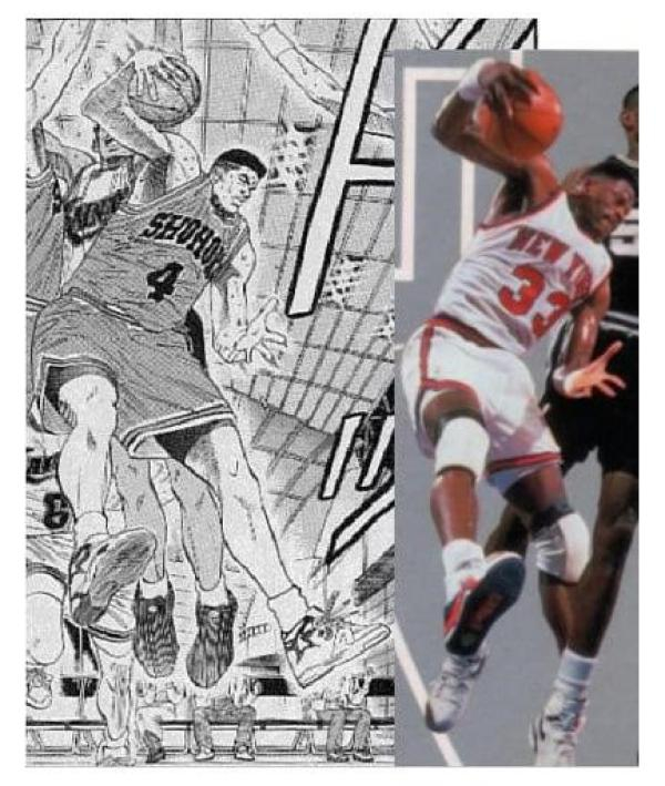 而《就像JORDAN》又回归了篮球题材,讲述被选拔的日本高中生代表进行集训,由三名一年级生对抗三年级生的故事,两个主要角色,几乎跟后来流川枫和牧绅一长得一模一样(名字却不同),里面还提到了日本高中生No.1叫“山田工业”,可谓“山王工业”的前身。至此可见井上对“流川枫”这个角色形象设定的偏爱。