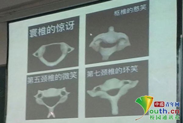 记者看到,在这张PPT上有四张图,分别是“寰椎的惊讶”“枢椎的憨笑”“第五颈椎的微笑”“第七颈椎的坏笑”。之所以会如此形容这几张图片,是因为图片中各个颈椎由于形状结构的不同,在视觉上呈现的效果就如同颈椎在做不同的表情。