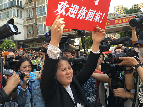 王启凤下车后,母亲刘登英举着牌子挤到女儿面前,两人相拥而泣。被媒体包围的王明清,晚了数分钟才与女儿拥抱。随后,一家人相互搀着走回了家。