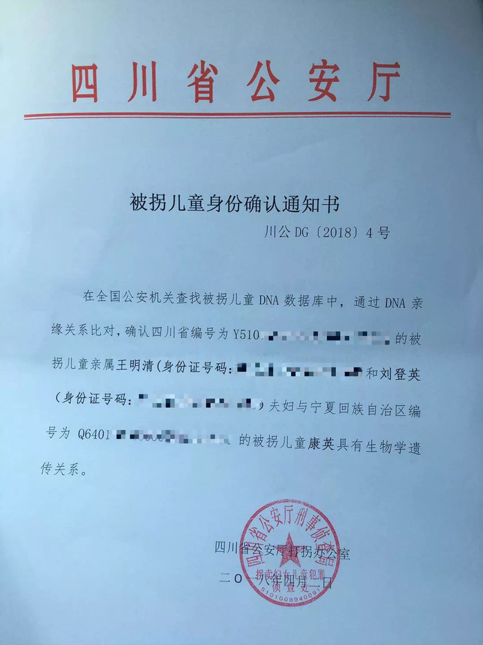 4月2日,四川省公安厅发布了被拐儿童身份确认书的文件,该文件写道:被拐儿童亲属王明清和刘登英夫妇与被拐儿童康英具有生物学遗传关系。