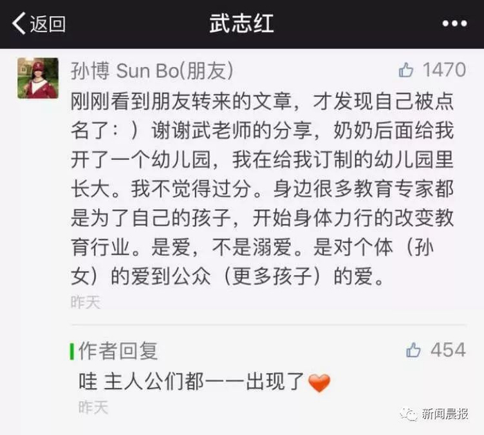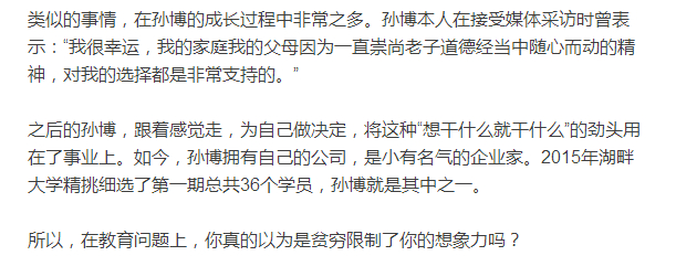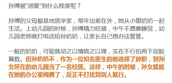 武志红对孙奶奶的讲述到这里为止。但孙博本人在武志红公号下留言就说:奶奶辞职当过一段时间校医之后,觉得幼儿园的教育理念确实有点问题,就给我独身定制了一个幼儿园,我在给我定制的幼儿园里长大!