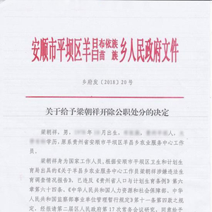 2018年3月23日,羊昌乡政府下发处分决定:梁朝祥违反《贵州省人口与计划生育条例》第六章第六十四条、《中华人民共和国人力资源和社会保障部、中华人民共和国监察部事业单位管理暂行规定》,予以开除公职处分。