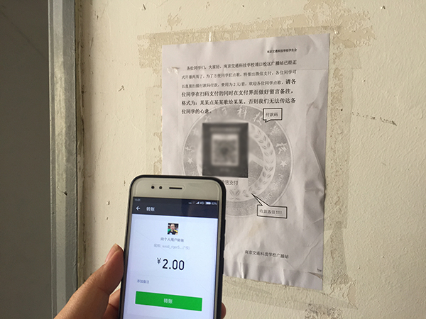 据该网友描述,该校浦口校区的食堂外和宿舍楼梯口,张贴着A4纸大小的海报,上面写着“广播站正式开播2周了,为方便同学们点歌,特推出微信支付,可以直接扫描付款码付款,费用为2元/首。”落款为“学生会”。澎湃新闻(www.thepaper.cn)记者扫描所留二维码后显示为“恩(*悦)”的个人账号。