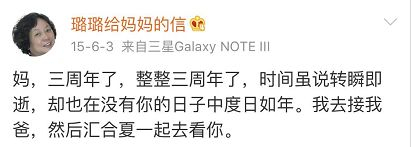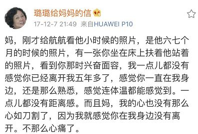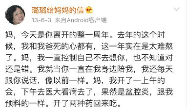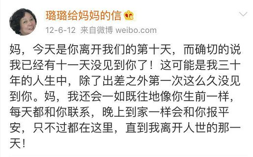 这是微博博主@璐璐给妈妈的信 在自己的微博签名中写的一段话。到今年,她的母亲已经去世6年了。