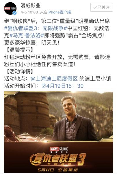 作为迪士尼今年在影片方面重磅打造的作品,同时也是整个漫威宇宙中时间轴上的关键节点,《复仇者联盟3:无限战争》的动态一直牵动着广大影迷。上月底,漫威官方在万众期待中宣布,影片将在5月11日登陆国内院线,并透露4月19日会在上海迪士尼小镇上举办红毯活动,但对于哪些“复联英雄”会来到红毯,官方此前一直秘而不宣。