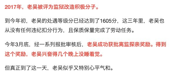 老吴进监狱三年多,因为表现优秀,没有被扣过一次分,这次经过层层报批审核,老吴成为杭州市西郊监狱此次清明小长假唯一一名获得离监探亲资格的服刑人员。