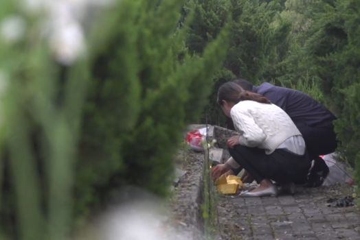 老吴默默蹲下,捋了捋墓碑上的杂草,然后利索地拿出祭祀用的水果,准备祭拜。
