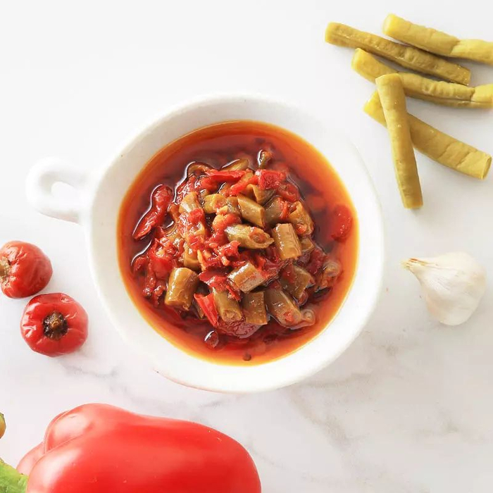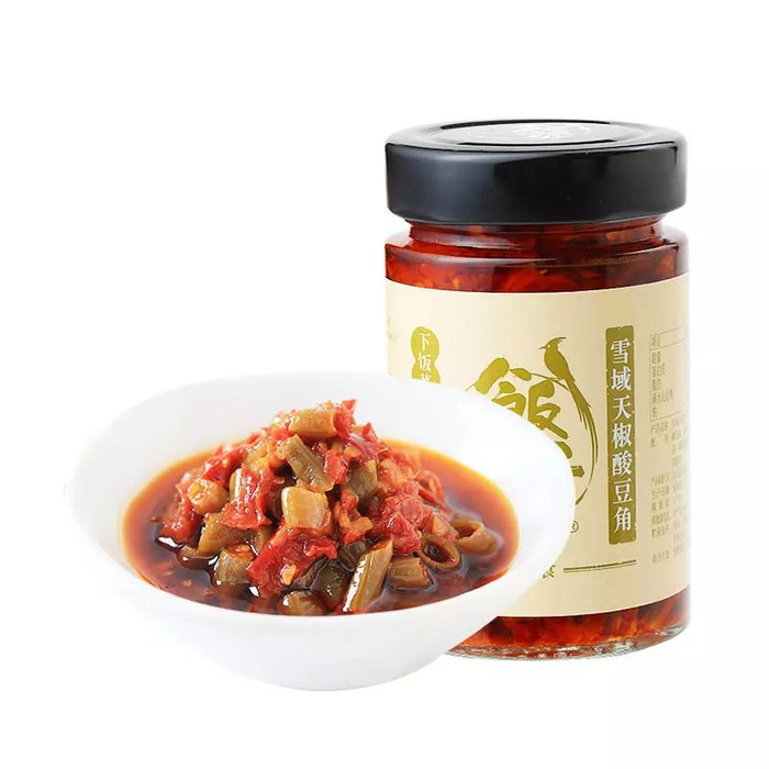 雪域天椒酸豆角选用四川传统炮制工艺,加入红辣椒炮制而成的。