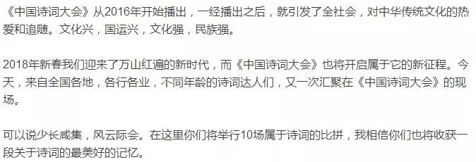 今晚就让我们共同在《中国诗词大会》的舞台上,再一次来感受中华文化的博大和包容,来感受诗词的永恒的魅力。