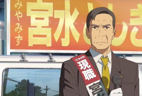 三叶的父亲、原神社神主、现任町长宫水俊树在街头为连任造势