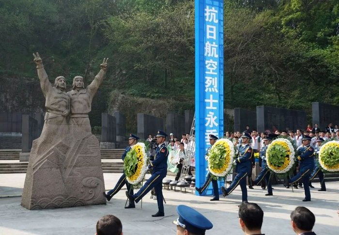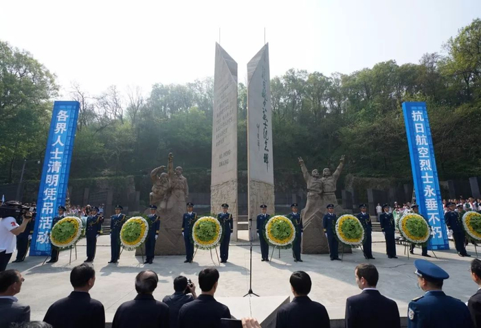 4月3日,各界人士凭吊抗日航空烈士活动在江苏南京抗日航空烈士纪念碑广场举行。江苏省暨南京市各界代表、部分抗日航空烈士亲属、空军官兵等500多人参加凭吊仪式,悼念和缅怀抗战期间在中国战场上牺牲的中外抗日航空英烈。