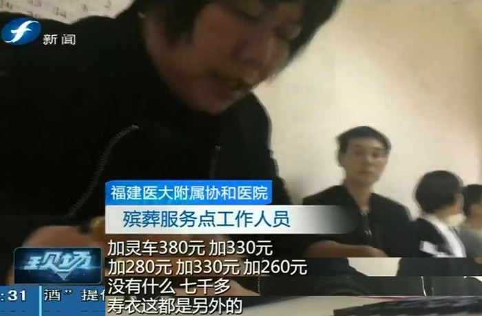 在福建省立医院的殡葬服务点内,工作人员能提供协议书和一张表格,上面注明了服务价格。但仔细一看,也只是大概内容,其中火化一项就分了4100和5600两种,工作人员的解释是,炉子好点……除此之外,寿衣、化妆等也都需要另外付费,全套操办下来,一般需要上万,甚至更贵。在去福州殡仪馆的途中,记者又遇上了一位推销员,捎带的还跟过来了一位业务员。这位业务员用随身带的计算器,一笔一笔算着费用,全套下来,最便宜也要一万五,相比记者之前的调查,可以说,更高。