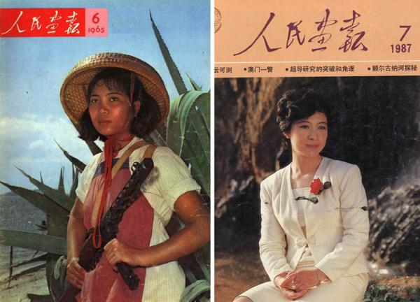 1965年,人民画报封面女性(左),人民画报1987年第7期的封面女性:电影演员王馥荔(右)。图片来源于网络