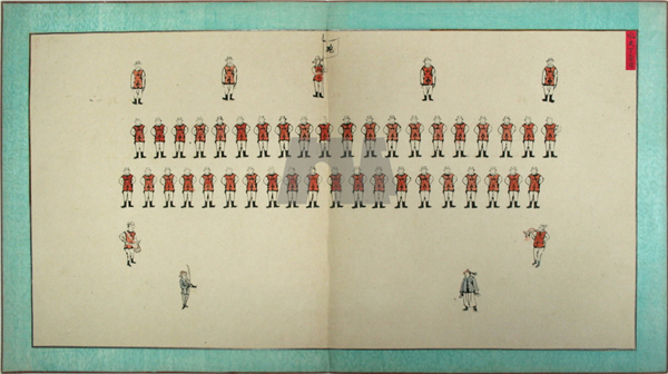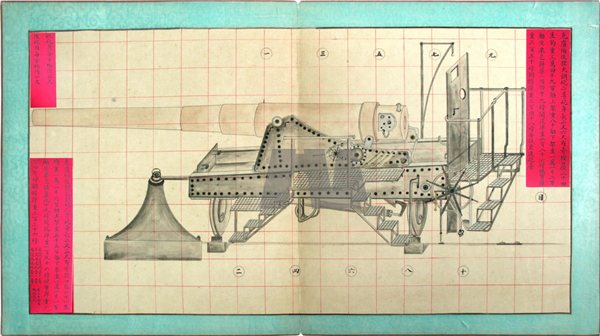 《招宝山炮台图册》共33页,每页宽62.5厘米、高33.3厘米,由三个部分组成。第一部分为首页,以精细入微的工笔画法,画出镇海口海防全图,包括甬江入海口全貌,以及定远、威远、安远、绥远、平远、靖远、宏远、南栏江等九座炮台布防的准确位置。第二部分为各式炮图,使用坐标图纸按照实际比例手绘而成。第三部分为炮台兵勇操练图,所练之操便是洋操。图册无作者署名,无具体年代,亦无解释说明;不过,通过图中细节可大致判断成画时间和画上部队性质。