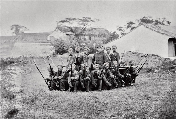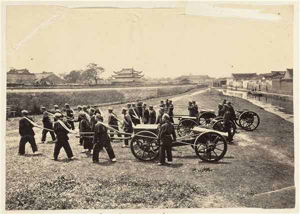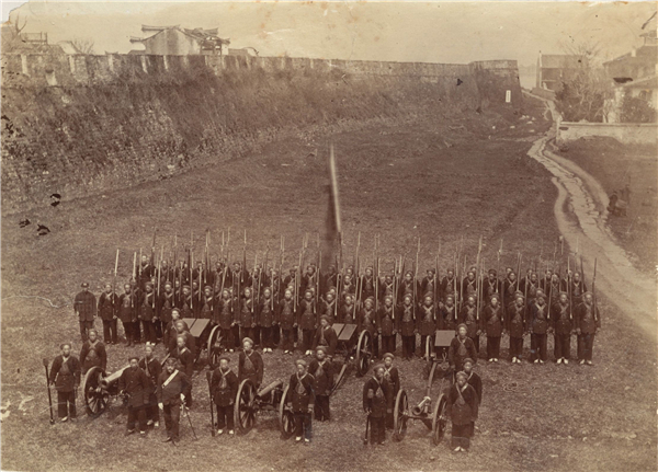 眼见洋操在淮军中的实践效果令人满意,清政府命令各地亦着力仿效。1861年1月,洋务派首领、恭亲王奕䜣就上奏:“探源之策,在于自强,自强之术,必先练兵。”(《筹办夷务始末,咸丰朝》)于是,清政府开展了长达数十年的练兵强兵行动。1862年,由总理衙门出面,在京城火器营、健锐营、圆明园等八旗士兵中先行选出千人到天津接受洋操训练,成为第一支使用洋枪洋炮的八旗部队。奕䜣还决定先令上海、福建两处仿照天津练兵之法,先行试办。其实,东南沿海各关键口岸早在前一年就掀起了洋操练兵的热潮。“同治元年(1861年),以上海、宁波等海口官兵,延欧洲人训练,令曾国藩、李鸿章、左宗棠等,酌选武员数十人,在上海、宁波习外国兵法,以副、参大员统之,学成之后,自行教练中国兵丁”(《清史稿·兵十》)。当时的洋人留下了数张宁绍台道台辖下宁郡卫安勇(清时,“宁”为宁波简称,南京多用“江”) 练习洋操的照片,都是难得一见的珍贵影像。