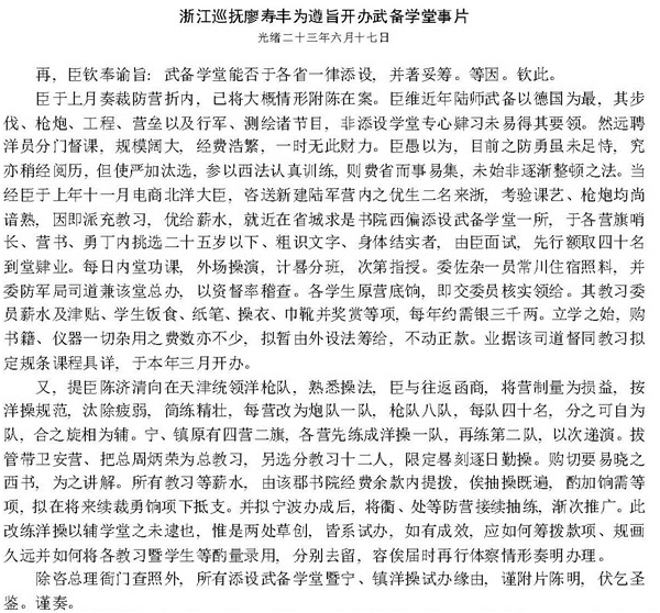 《浙江巡抚廖寿丰为遵旨开办武备学堂事片》